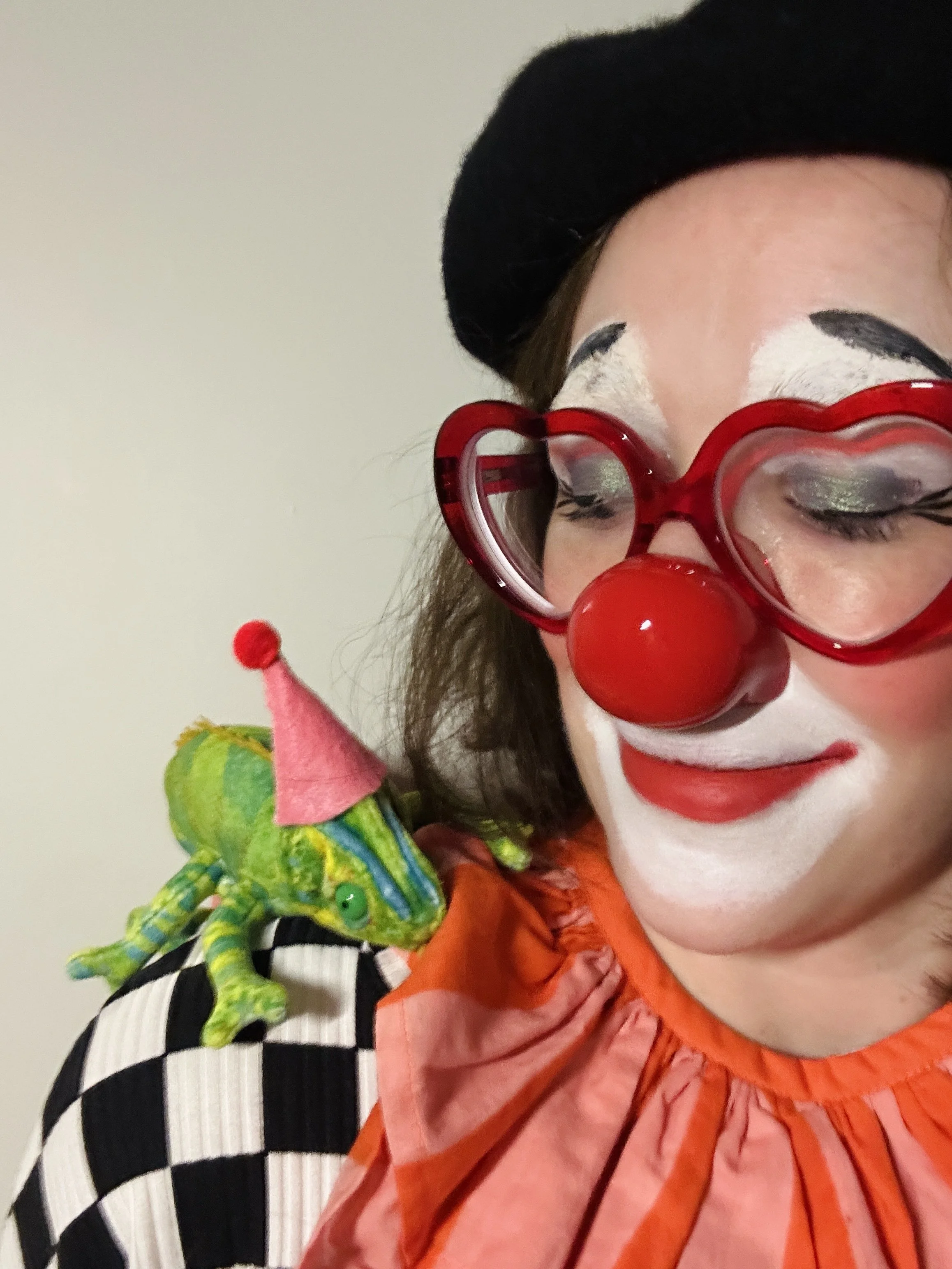 Plums the Clown is also known as Angie Meltsner. In 2025, Angie started taking modern clowning classes while working through The Artist’s Way. She realized she could (and should!) live a life more full of play, joy, and laughter, and could (and should!) share in that with her local community as well. Thus, Plums was born. Along with continuing her clowning education, she is working on juggling and magic tricks to help Plums become even more of a delightful entertainer!